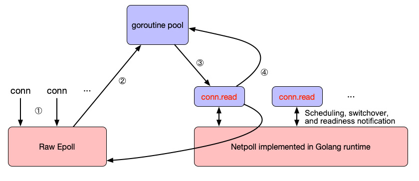 The RawEpoll model is shown in the above figure. After a readable event is detected by epoll, a goroutine is allocated from the goroutine pool to process the event. The procedure is as follows: